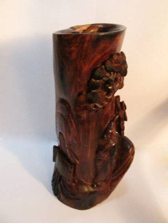 黄花梨松下怀古诗意纹笔筒,高26.5cm 此笔筒采用名贵黄花梨木料,运用深浮雕技法雕刻而成。苍松之下一位老者,发髻耸,须髯飘飘,驻足远眺,神情自若。远山、近水、桥榭、兰草,一副自然和谐的画图跃然出现,在观赏之时,思绪不由自主的已进入画面之佳境。黄花梨松下怀古诗意纹笔筒