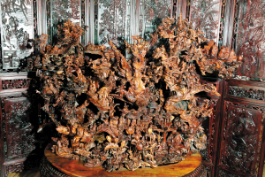 这是一件大型的群仙祝寿摆件作品,高为1米5,宽为1米7,厚度也在75厘米,由千余斤海南黄花梨老料精心雕琢而成,构筑了一个喜庆热闹的贺寿场面。画面中,王母娘娘仪态谦和,端坐中央,各路神仙有的从空中来,有的从海上来,或腾云或驾鹤,纷纷前往祝寿。此件作品除了形制硕大,另一看点就是雕工精到,人物形象神态惟妙惟肖,树植与祥云都颇见功底,亭台楼阁隐于形而现于转角,不论是下棋的仙翁、树下小憩的弥勒、小桥相遇的仙者、采莲的童子,还是工匠巧妙地利用天然木包石效果雕刻出独特的造型,都凸显着作品巧夺天工的技艺。此件作品无论是从画面结构的完整性,还是从材质的珍稀性与雕工设计的精巧性上来讲,堪称是黄花梨业界有史以来独一无二的作品,收藏价值不言而喻。
