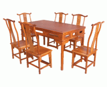 ★此套家具椅子为四出头官冒椅,搭脑两端微向下垂,至尽头又向上挑起,有如古代官员的帽翅。靠背成100度倾斜,S形曲线使人的后背与椅背有较大的接触连带面,肌肉和韧带能在就餐时得到充分的休息。加上黄花梨桌更显协调、大气、浑然一体,把清代家具变肃穆为流