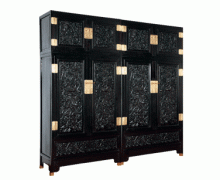 ★此柜是紫檀雕云龙纹顶箱柜,顶竖柜的门正面打槽装板,落堂踩鼓。上下门心板对称雕云龙纹。柜门下有闷仓,俗称“肚柜”。边框安铜镀金合页及面叶。