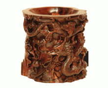 黄花梨松下怀古诗意纹笔筒,高26.5cm 此笔筒采用名贵黄花梨木料,运用深浮雕技法雕刻而成。苍松之下一位老者,发髻耸,须髯飘飘,驻足远眺,神情自若。远山、近水、桥榭、兰草,一副自然和谐的画图跃然出现,在观赏之时,思绪不由自主的已进入画面之佳境。